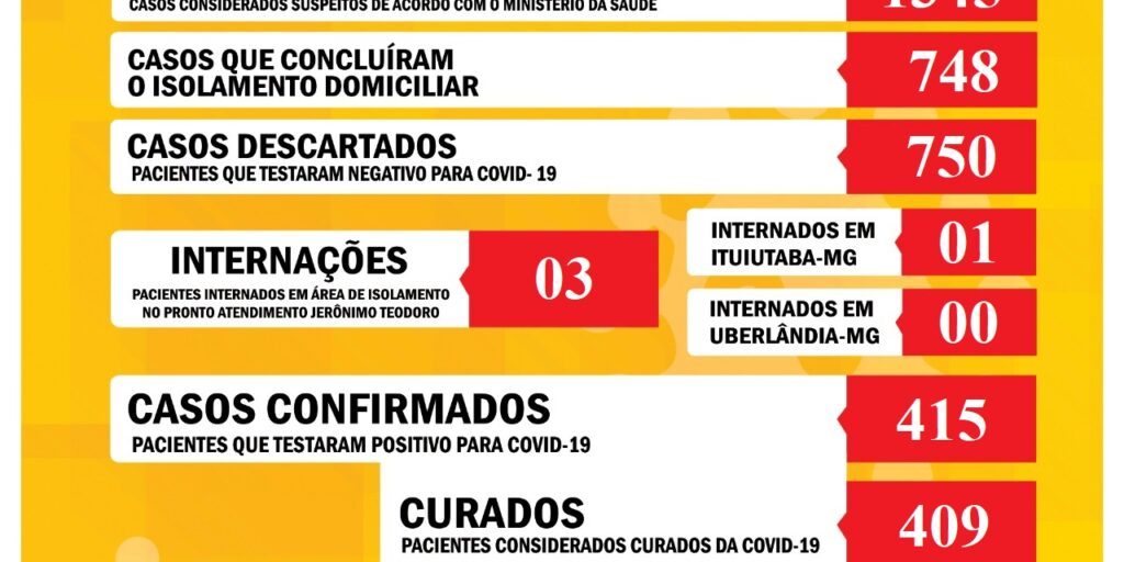 Por outro lado, o boletim registrou mais um paciente curado da Covid-19. Agora são 409 pacientes que concluíram o período de transmissibilidade da doença em Santa Vitória.